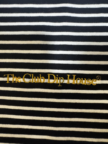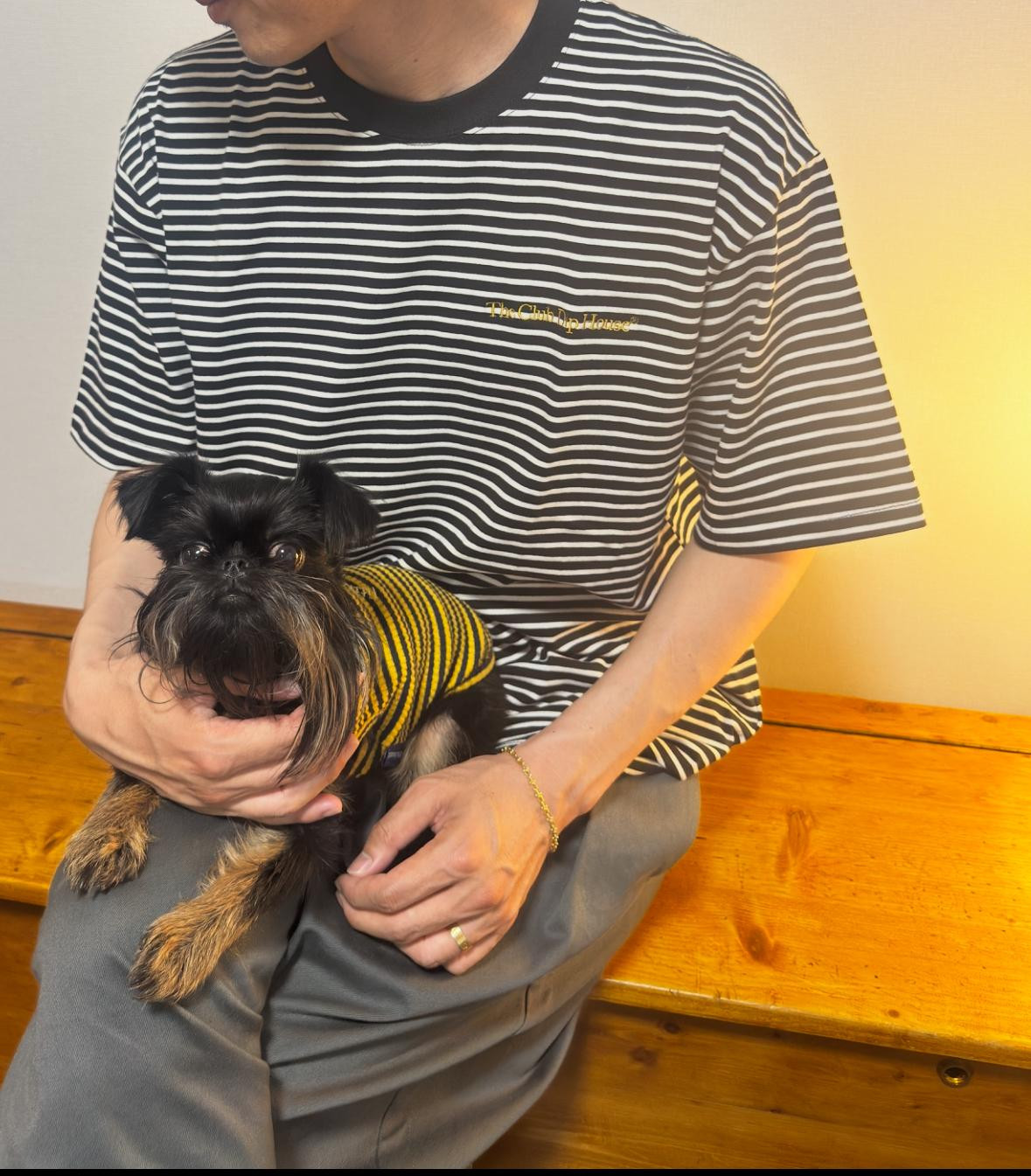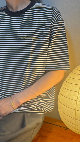 ゴールドのロゴをあしらった、ボーダーTシャツ。 160cm Mサイズ着用 175cm XLサイズ着用