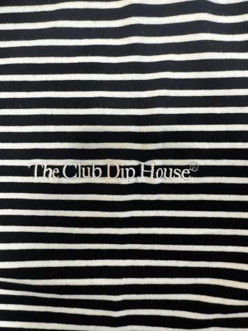 ホワイトのロゴをあしらった、ボーダーTシャツ。 160cm Mサイズ着用 175cm XLサイズ着用
